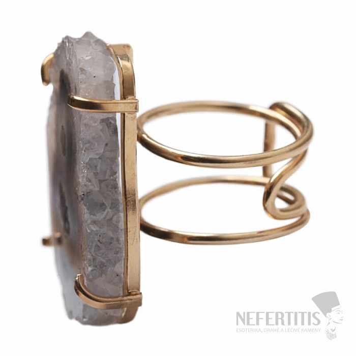 Objavte kúzlo elegancie s týmto pozláteným prsteňom, ktorého dominantou je rez kvapľníkom - stalaktitom ametystu. Každý kameň je originál. Ametyst je kameňom lásky, vášne a porozumenia. Materiál: prírodný kameň, pozlátená mosadz. Kupujete priamo vyobrazený prsteň.