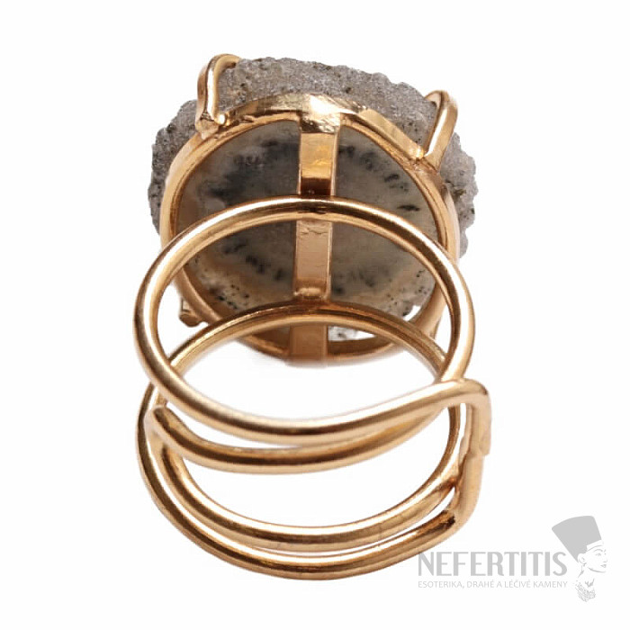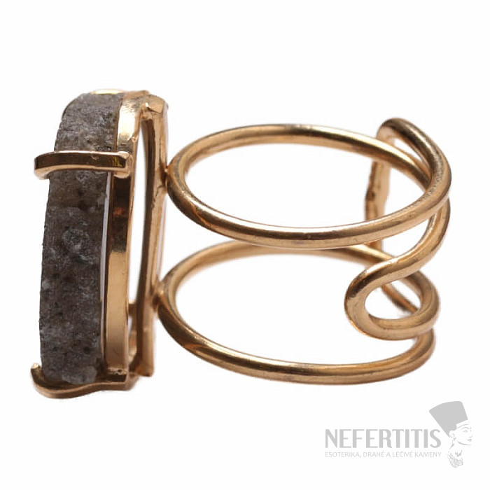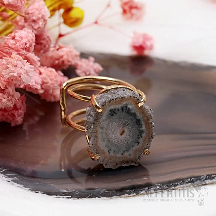 Objavte kúzlo elegancie s týmto pozláteným prsteňom, ktorého dominantou je rez kvapľníkom - stalaktitom ametystu. Každý kameň je originál. Ametyst je kameňom lásky, vášne a porozumenia. Materiál: prírodný kameň, pozlátená mosadz. Kupujete priamo vyobrazený prsteň.