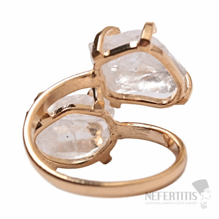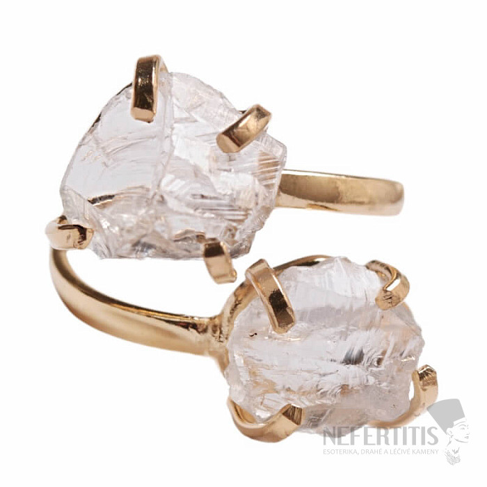 Objavte kúzlo nežnej elegancie s týmto pozláteným prsteňom, ktorého dominantou sú dva kryštály krištáľu. Každý kameň je originál. Krištáľ je považovaný za univerzálny kryštál. Jeho nepravidelný tvar a prírodná krása z neho robia jedinečný šperk s dušou. Materiál: prírodný kameň, pozlátená mosadz. Kupujete priamo vyobrazený prsteň.