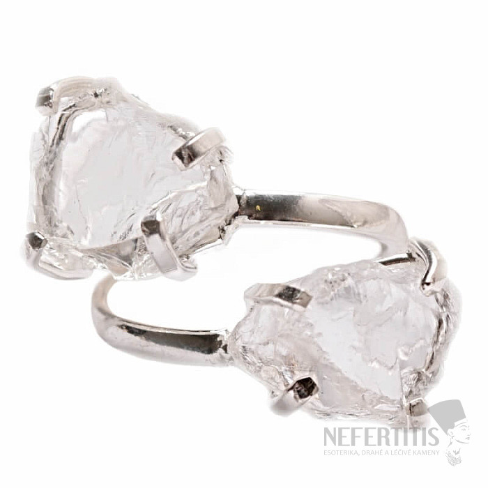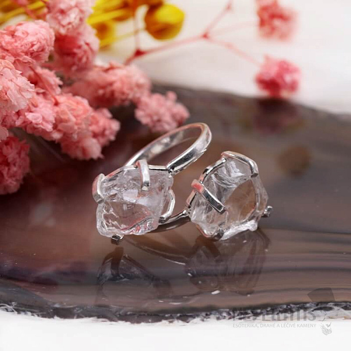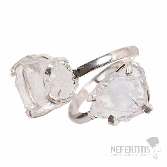 Objavte kúzlo nežnej elegancie s týmto postriebreným prsteňom, ktorého dominantou sú dva kryštály krištáľu. Každý kameň je originál. Krištáľ je považovaný za univerzálny kryštál. Jeho nepravidelný tvar a prírodná krása z neho robia jedinečný šperk s dušou. Materiál: prírodný kameň, postriebrená mosadz. Kupujete priamo vyobrazený prsteň.