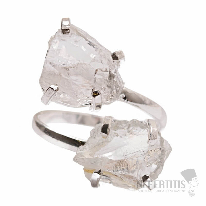 Objavte kúzlo nežnej elegancie s týmto postriebreným prsteňom, ktorého dominantou sú dva kryštály krištáľu. Každý kameň je originál. Krištáľ je považovaný za univerzálny kryštál. Jeho nepravidelný tvar a prírodná krása z neho robia jedinečný šperk s dušou. Materiál: prírodný kameň, postriebrená mosadz. Kupujete priamo vyobrazený prsteň.