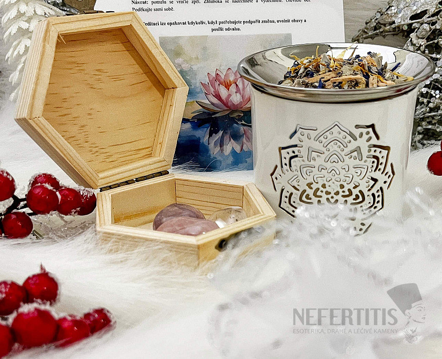 krásna drevená krabička s tromi kameňmi pre vaše splnové rituály: krištáľ, ametyst a ruženín