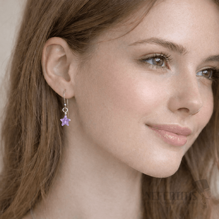 Tieto strieborné visiace náušnice 925/1000 sú zdobené fialovými hviezdičkami, ktoré tvoria dominantný, ale stále jemný prvok celého šperku. Motív hviezdy v kombinácii s fialovou farbou pôsobí elegantne, originálne a ľahko mysticky, pričom si náušnice zachovávajú každodennú nositeľnosť.