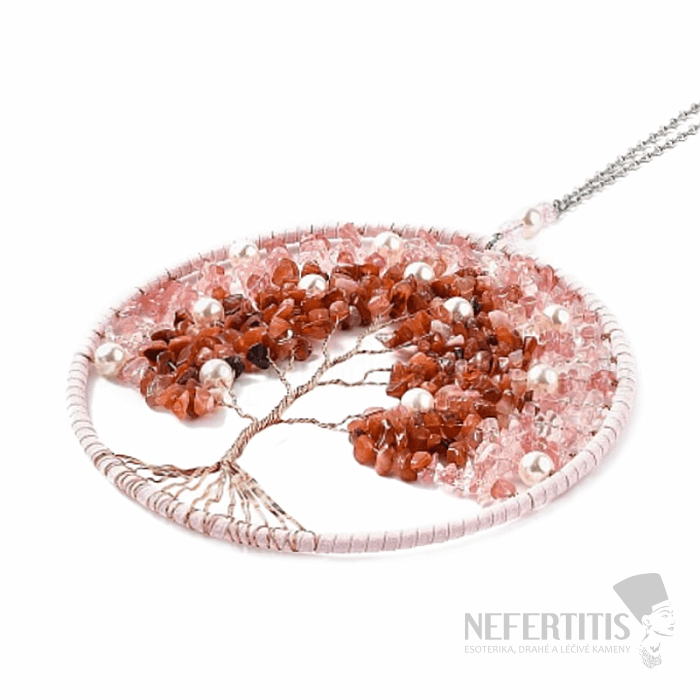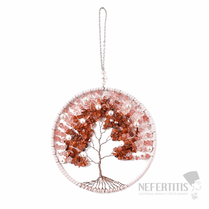Feng Shui ochranný záves Strom života z červeného jaspisu a jahodového krištáľu, vhodný domov, kancelárie, zimné záhrady alebo autá. Záves použite na potlačenie negatívnych pocitov, na podporenie lásky a trpezlivosti. Materiál: prírodný kameň, kov, medený drôtik, syntetické korálky, imitácia perál, dĺžka závesu cca 29 cm, Priemer kruhu cca 16 cm. Ilustratívne vyobrazenie. Veľkosť, štruktúra kameňa, jeho kresba a farebnosť sa môže mierne líšiť, vždy však obdržíte záves porovnateľnej kvality.