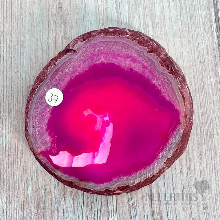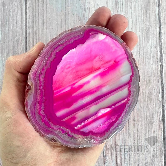Atraktívny leštený plátok achátu. Dekoratívny prvok, ktorý vzniká rozrezaním a leštením prírodného achátu. Tento achátový plátok je dofarbovaný. Kupujete priamo vyobrazený kus. Krajina pôvodu: Brazília Achátové… viac »