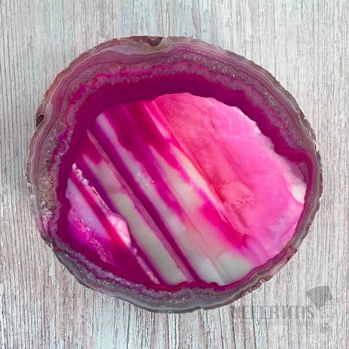 Atraktívny leštený plátok achátu. Dekoratívny prvok, ktorý vzniká rozrezaním a leštením prírodného achátu. Tento achátový plátok je dofarbovaný. Kupujete priamo vyobrazený kus.