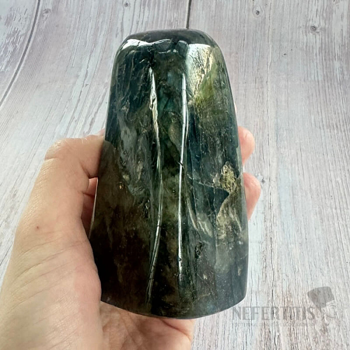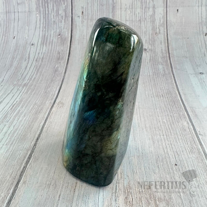 Nádherný, ručne leštený dúhový labradorit voľného tvaru s výraznou hrou farieb, v ktorej sa pri dopade svetla kúzelne rozžiari jasná modrá farba. Dekoratívne freeform vo výberovej kvalite.