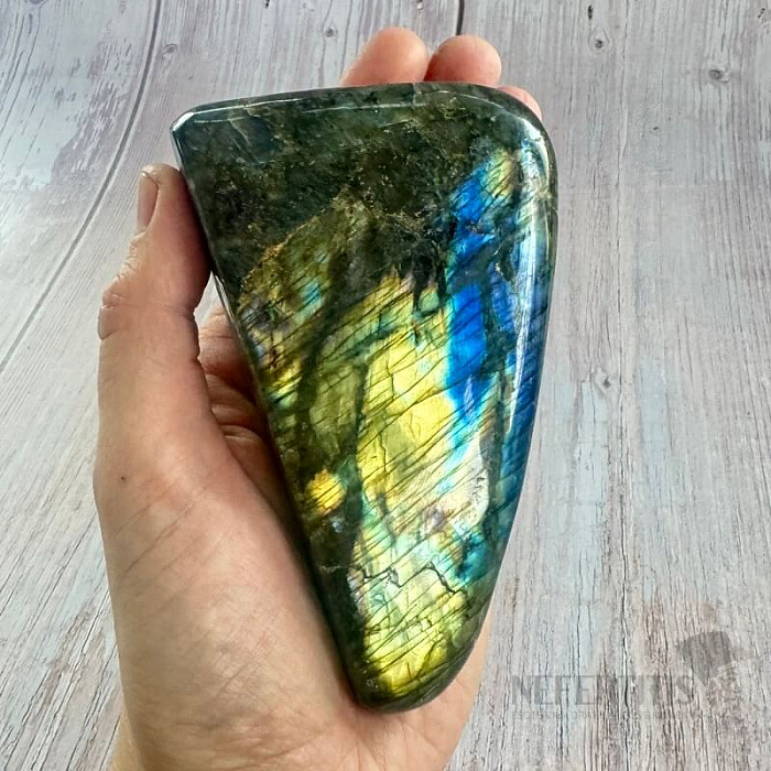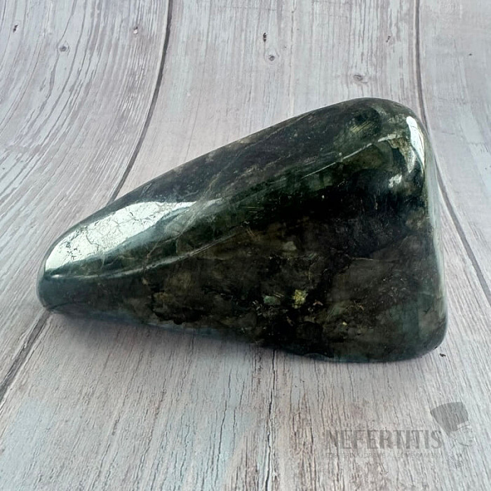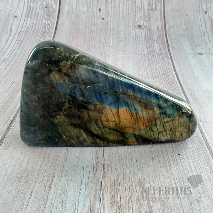 Nádherný, ručne leštený dúhový labradorit voľného tvaru s výraznou hrou farieb, v ktorej sa pri dopade svetla kúzelne rozžiari jasná modrá farba. Dekoratívne freeform vo výberovej kvalite.