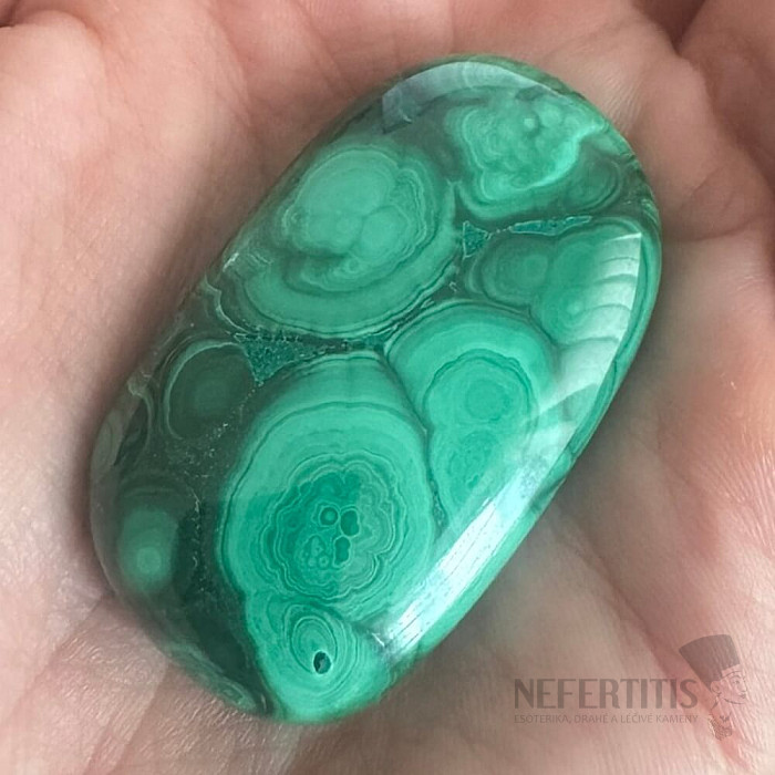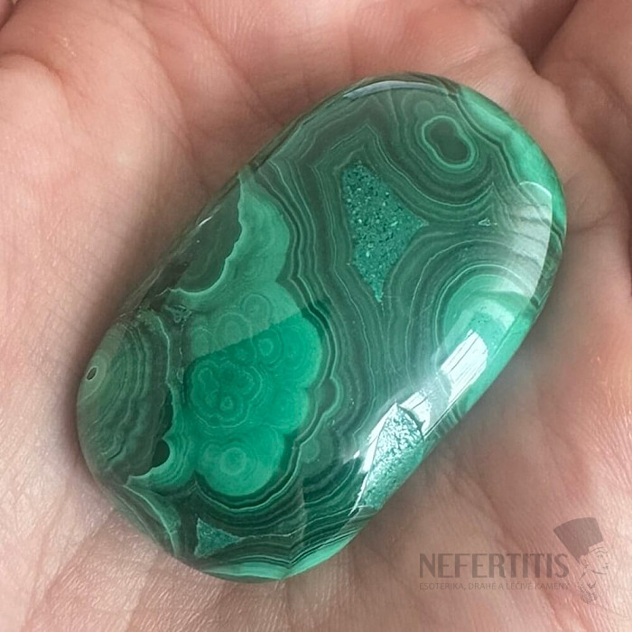 Leštená, ohladená hmatka z malachitu s veľmi peknou a výraznou kresbou. Kupujete priamo vyobrazenú hmatku.