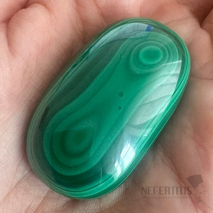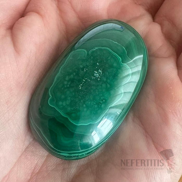 Leštená, ohladená hmatka z malachitu s veľmi peknou a výraznou kresbou. Kupujete priamo vyobrazenú hmatku.