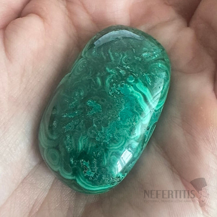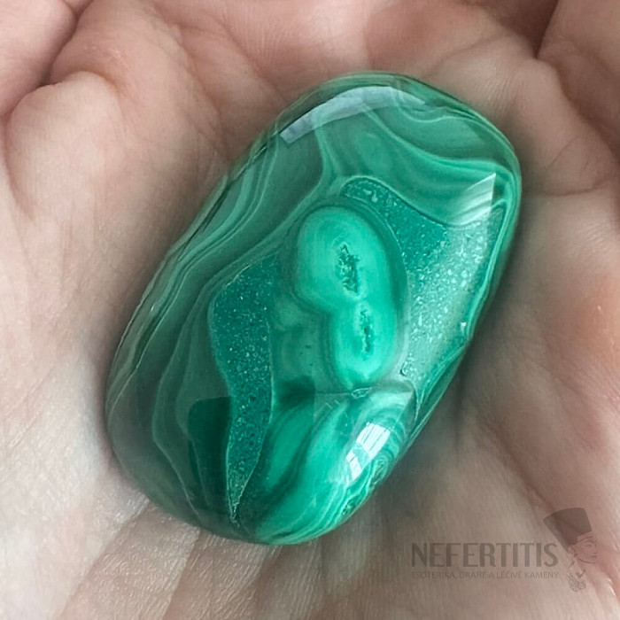 Leštená, ohladená hmatka z malachitu s veľmi peknou a výraznou kresbou. Kupujete priamo vyobrazenú hmatku.