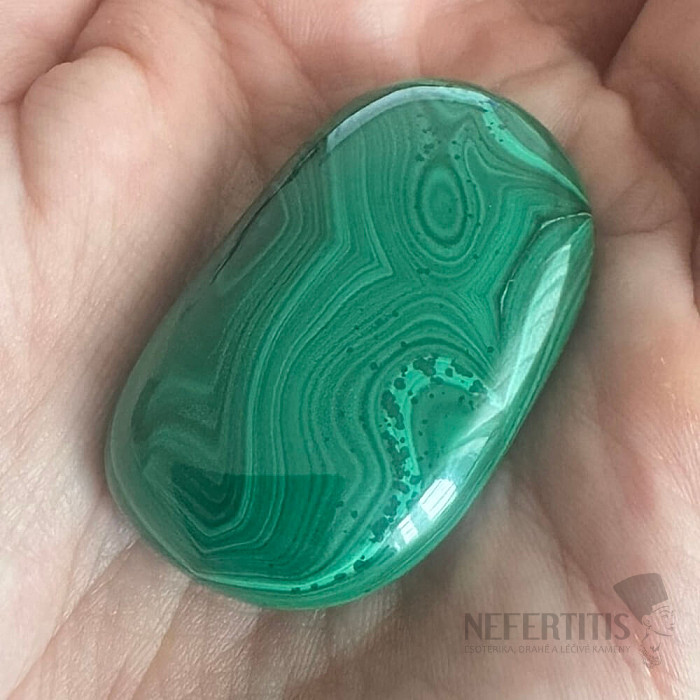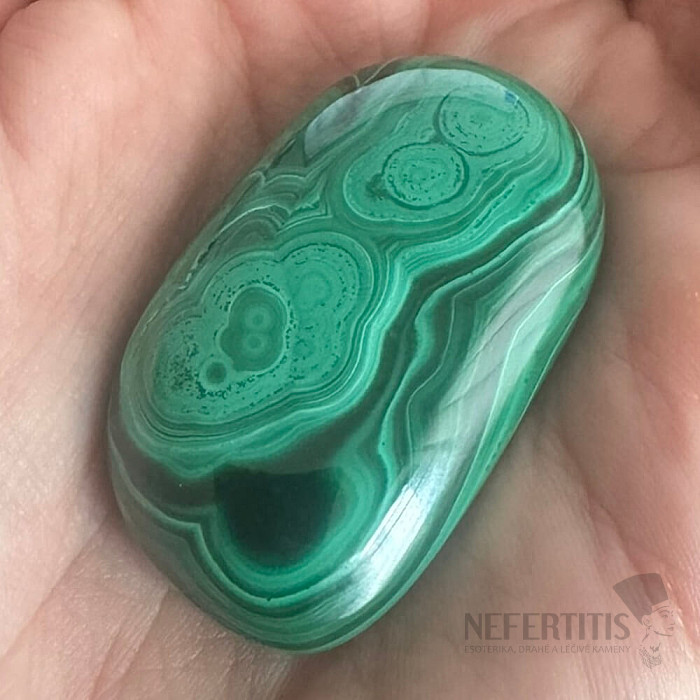Leštená, ohladená hmatka z malachitu s veľmi peknou a výraznou kresbou. Kupujete priamo vyobrazenú hmatku.