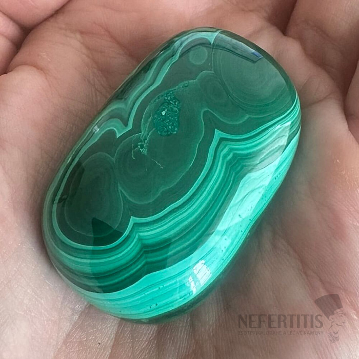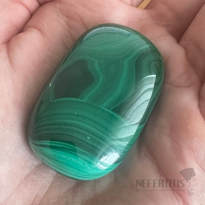 Leštená, ohladená hmatka z malachitu s veľmi peknou a výraznou kresbou. Kupujete priamo vyobrazenú hmatku.