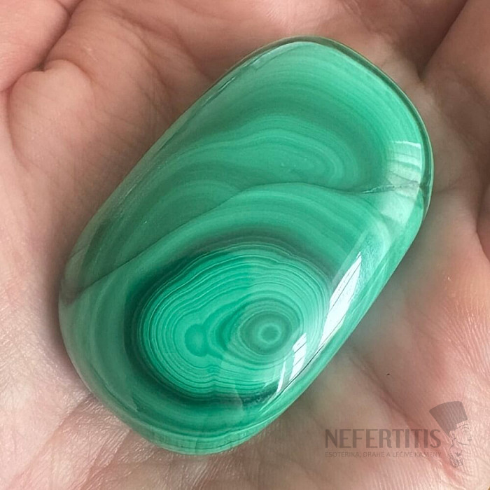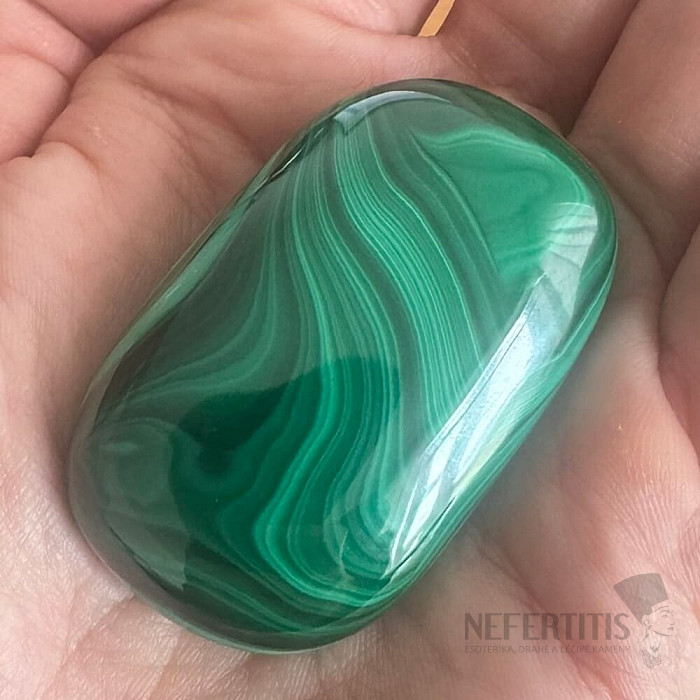 Leštená, ohladená hmatka z malachitu s veľmi peknou a výraznou kresbou. Kupujete priamo vyobrazenú hmatku.