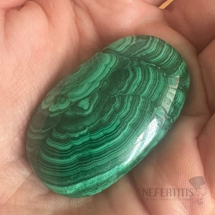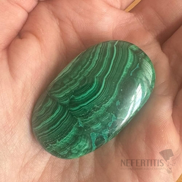 Leštená, ohladená hmatka z malachitu s veľmi peknou a výraznou kresbou. Kupujete priamo vyobrazenú hmatku.