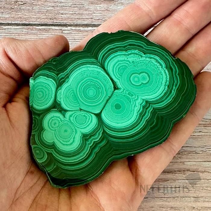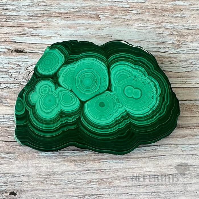 Leštený, ohladený plátok malachitu s veľmi peknou a výraznou kresbou, ohladený z oboch strán s jemným leskom. Kupujete priamo vyobrazený kus malachitu.