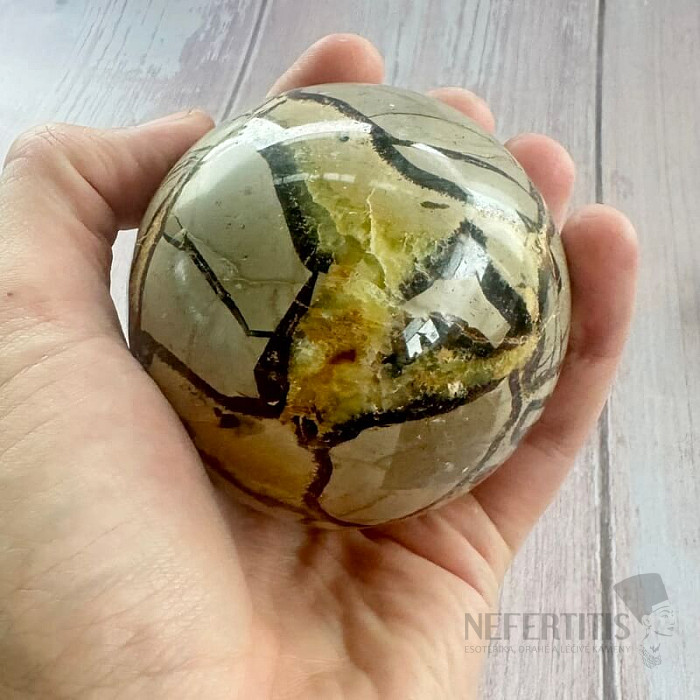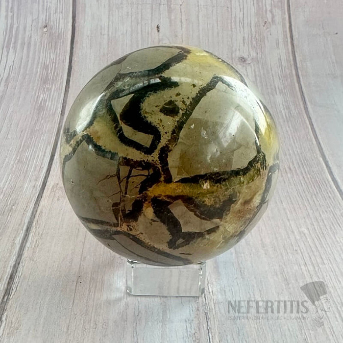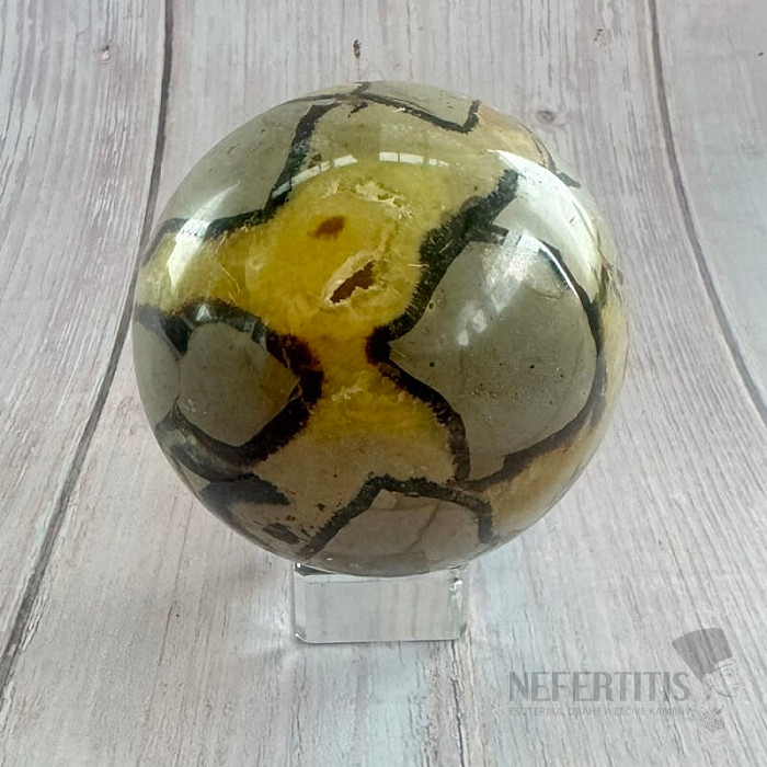Leštená septária v tvare gule vo výberovej kvalite. Krajina pôvodu: Madagaskar. Kupujete priamo vyobrazenú septáriu. Stojančeky a podstavce pod minerálmi kúpite tu. Upozornenie: kameň nie je dokonale ohladený, nechtom… viac »