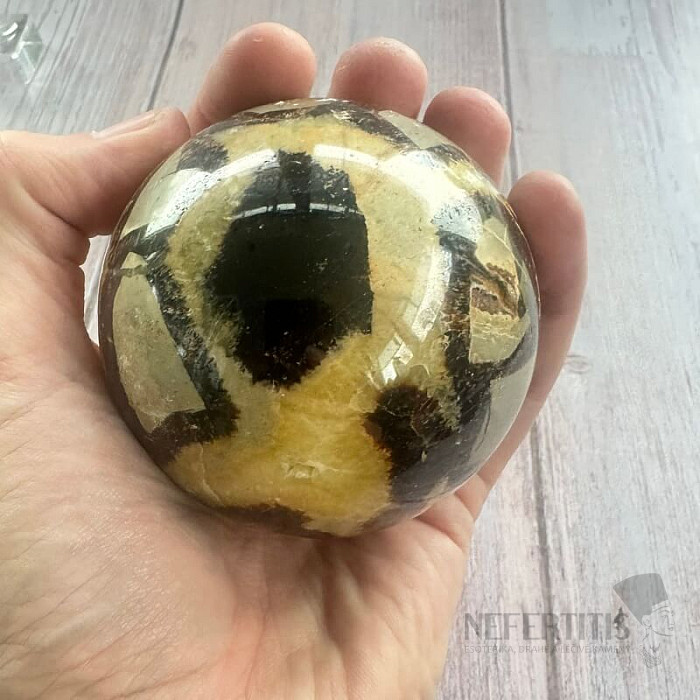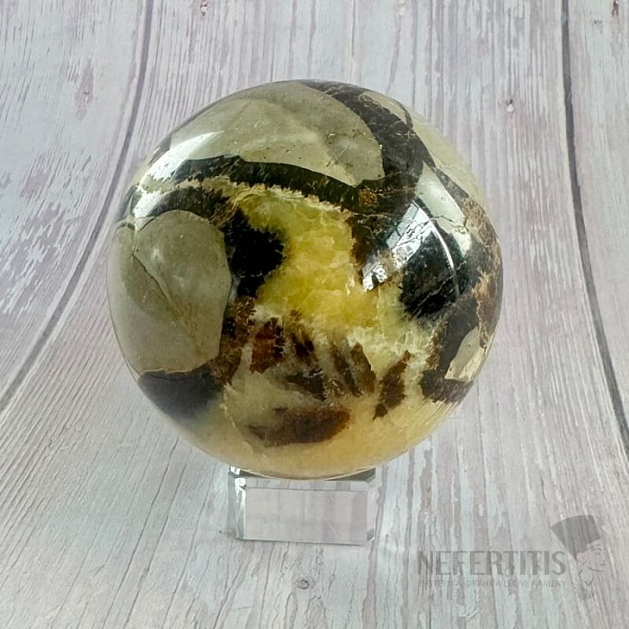 Leštená septária v tvare gule vo výberovej kvalite. Krajina pôvodu: Madagaskar. Kupujete priamo vyobrazenú septáriu. Stojančeky a podstavce pod minerálmi kúpite tu. Upozornenie: kameň nie je dokonale ohladený, nechtom… viac »