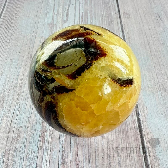 Leštená septária v tvare gule vo výberovej kvalite. Krajina pôvodu: Madagaskar. Kupujete priamo vyobrazenú septáriu. Stojančeky a podstavce pod minerálmi kúpite tu. Upozornenie: kameň nie je dokonale ohladený, nechtom… viac »