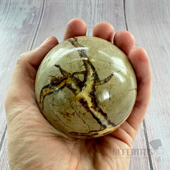 Leštená septária v tvare gule vo výberovej kvalite. Krajina pôvodu: Madagaskar. Kupujete priamo vyobrazenú septáriu. Stojančeky a podstavce pod minerálmi kúpite tu. Upozornenie: kameň nie je dokonale ohladený, nechtom… viac »