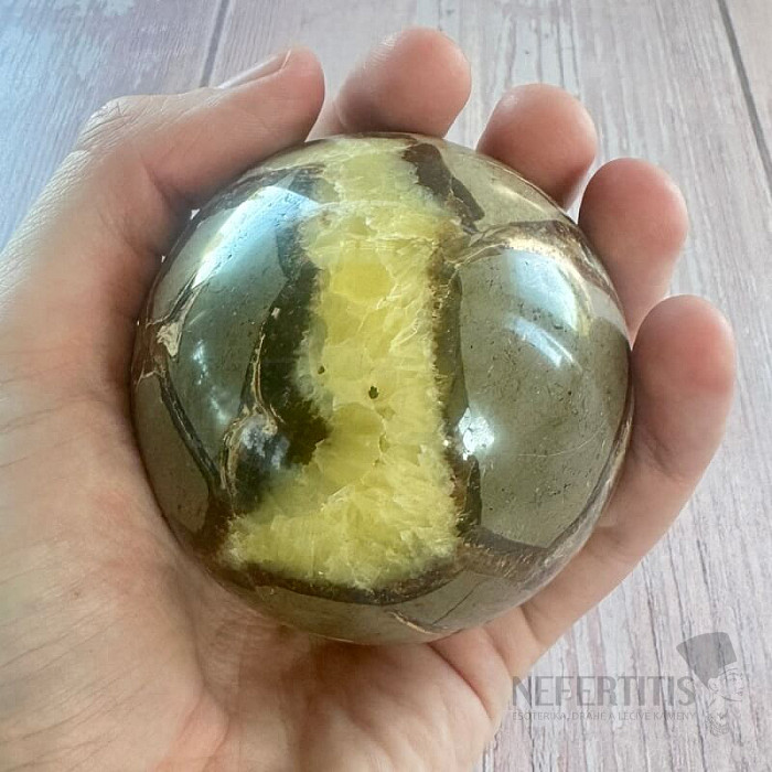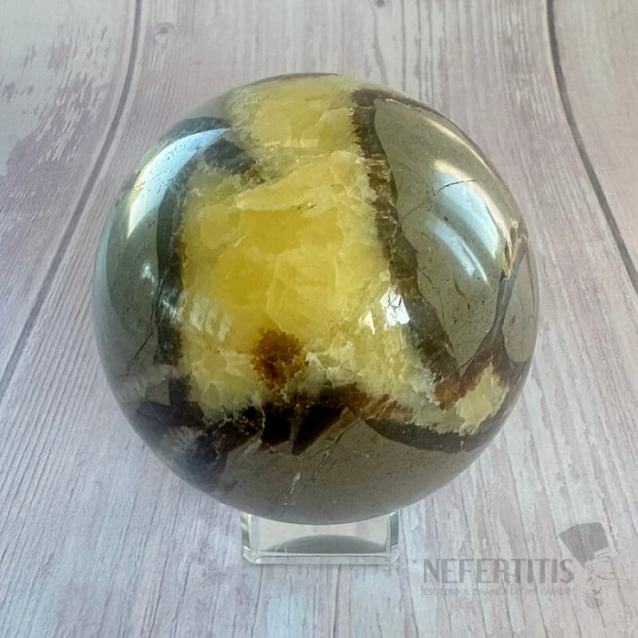 Leštená septária v tvare gule vo výberovej kvalite. Krajina pôvodu: Madagaskar. Kupujete priamo vyobrazenú septáriu. Stojančeky a podstavce pod minerálmi kúpite tu. Upozornenie: kameň nie je dokonale ohladený, nechtom… viac »